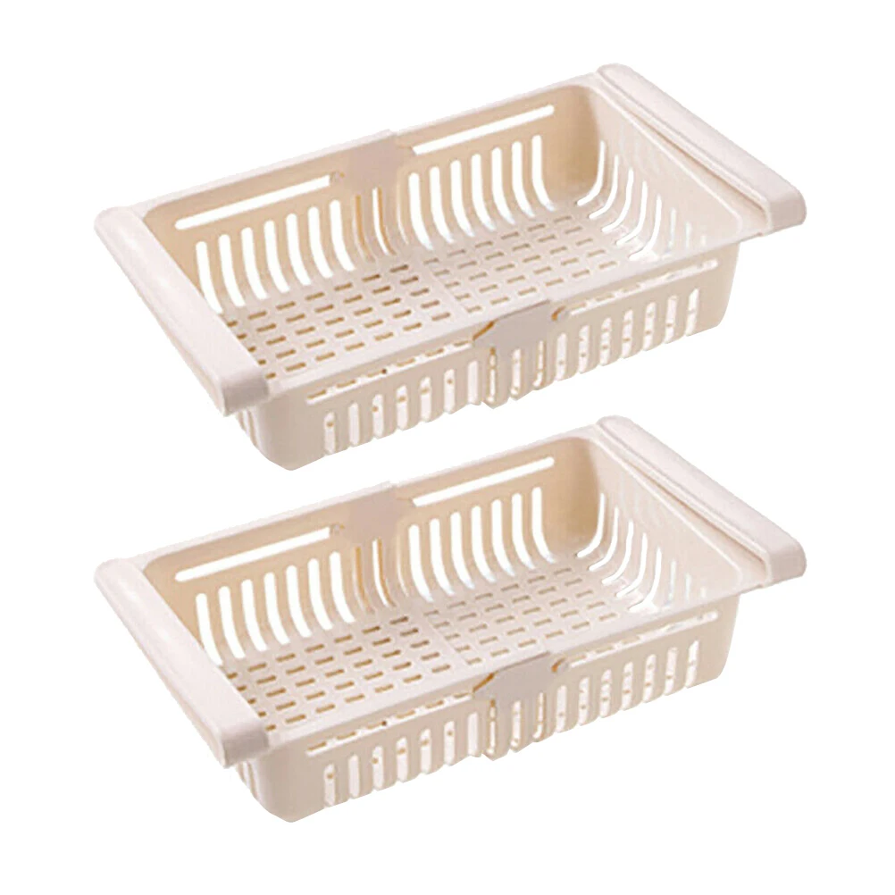 Esse produto da imagem é um organizador retrátil para geladeira feito em plástico resistente e eco-friendly.