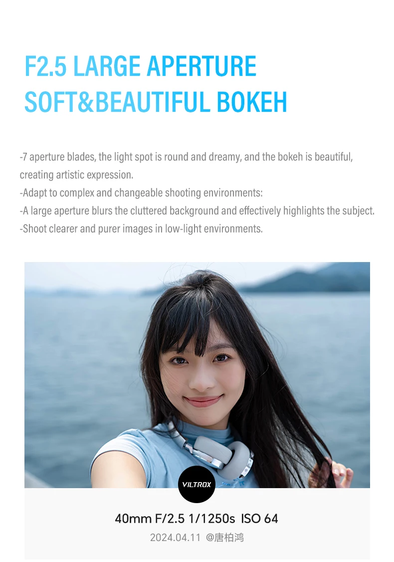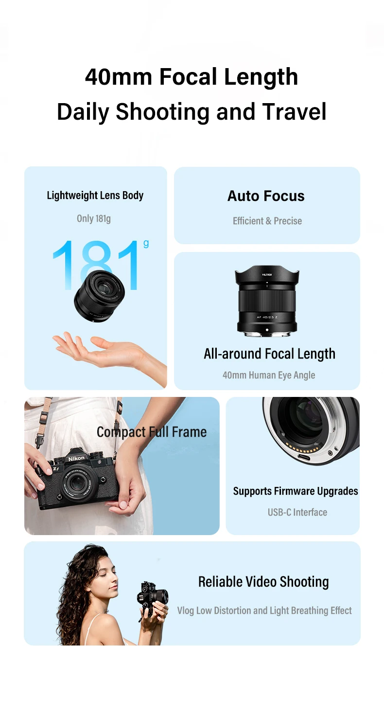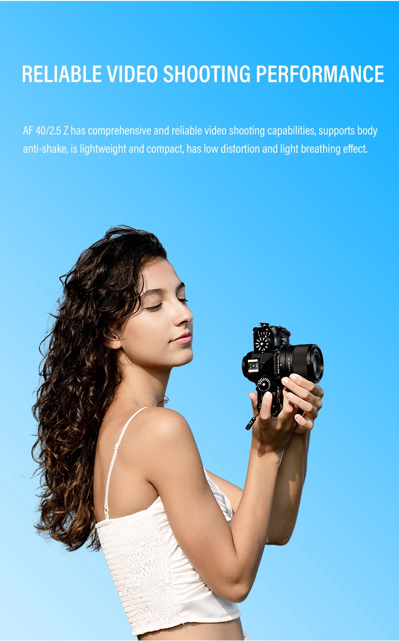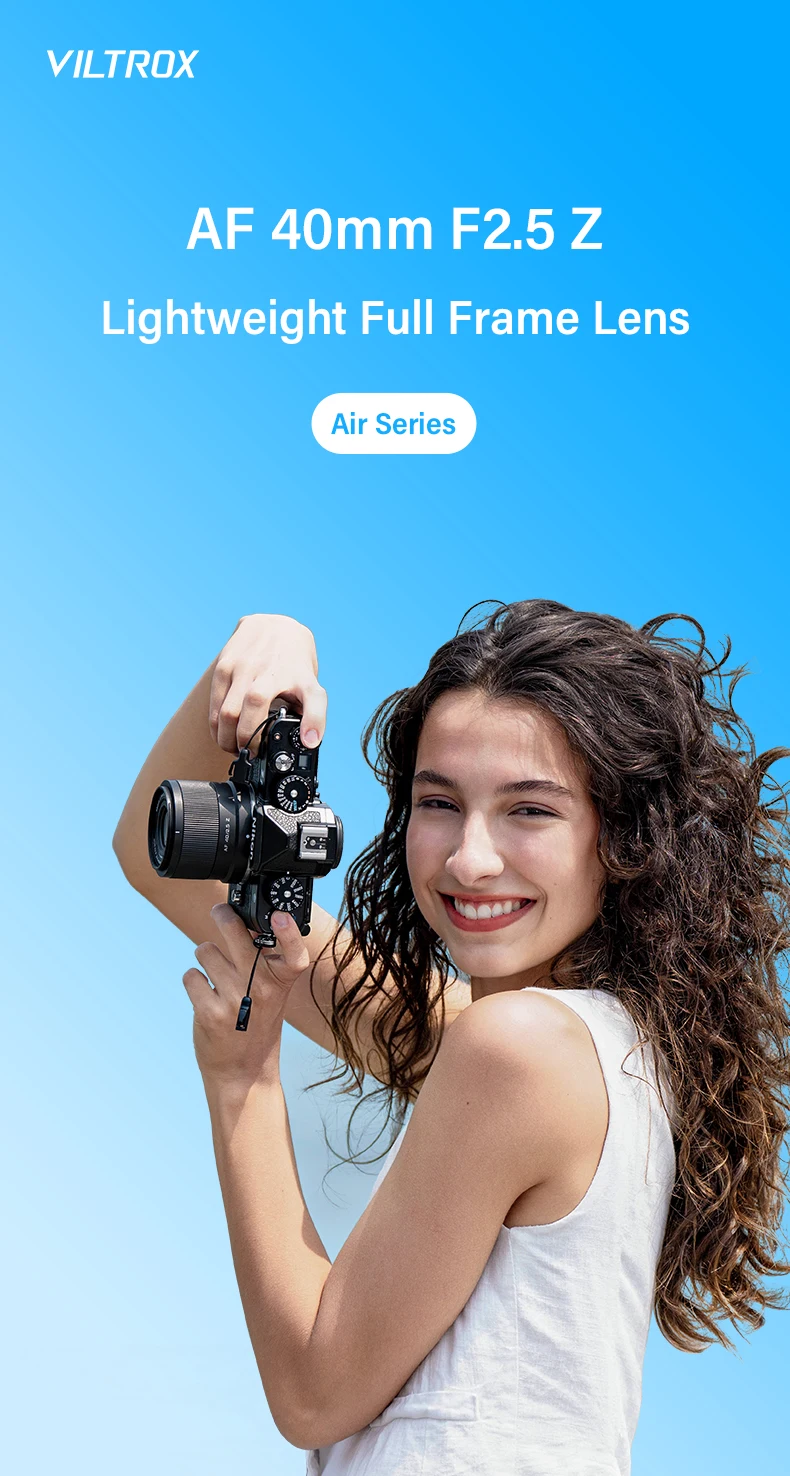 AF 40mm F2.5 Z, Viltrox Air series lightweight full-frame series introduces a 40mm focal length, efficient and precise autofocus system to capture wonderful moments, so that everyone can enjoy the fun of photography. Covers the full-frame image field and matches more models. Compact and lightweight lens body, easy to carry. The versatile 40mm focal length is ideal for daily shooting and travel.