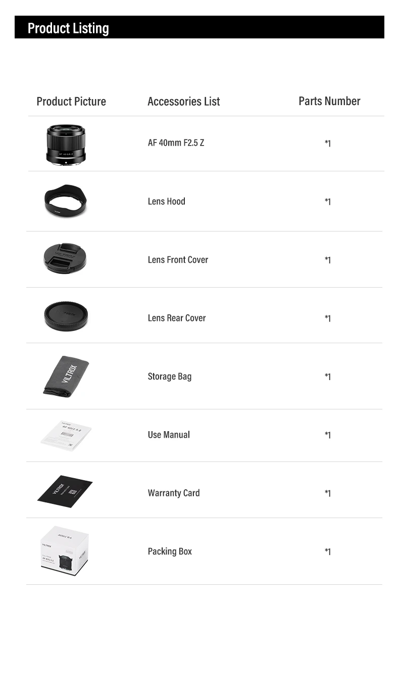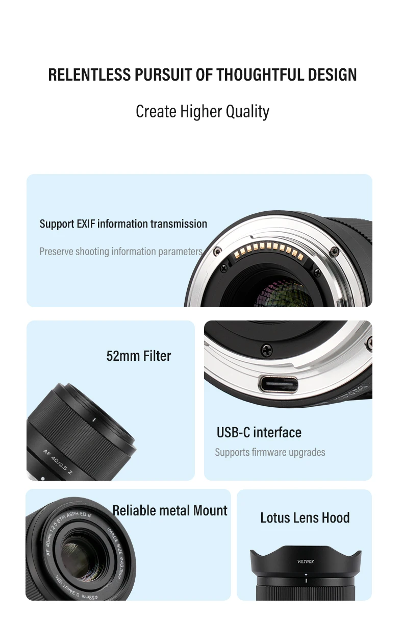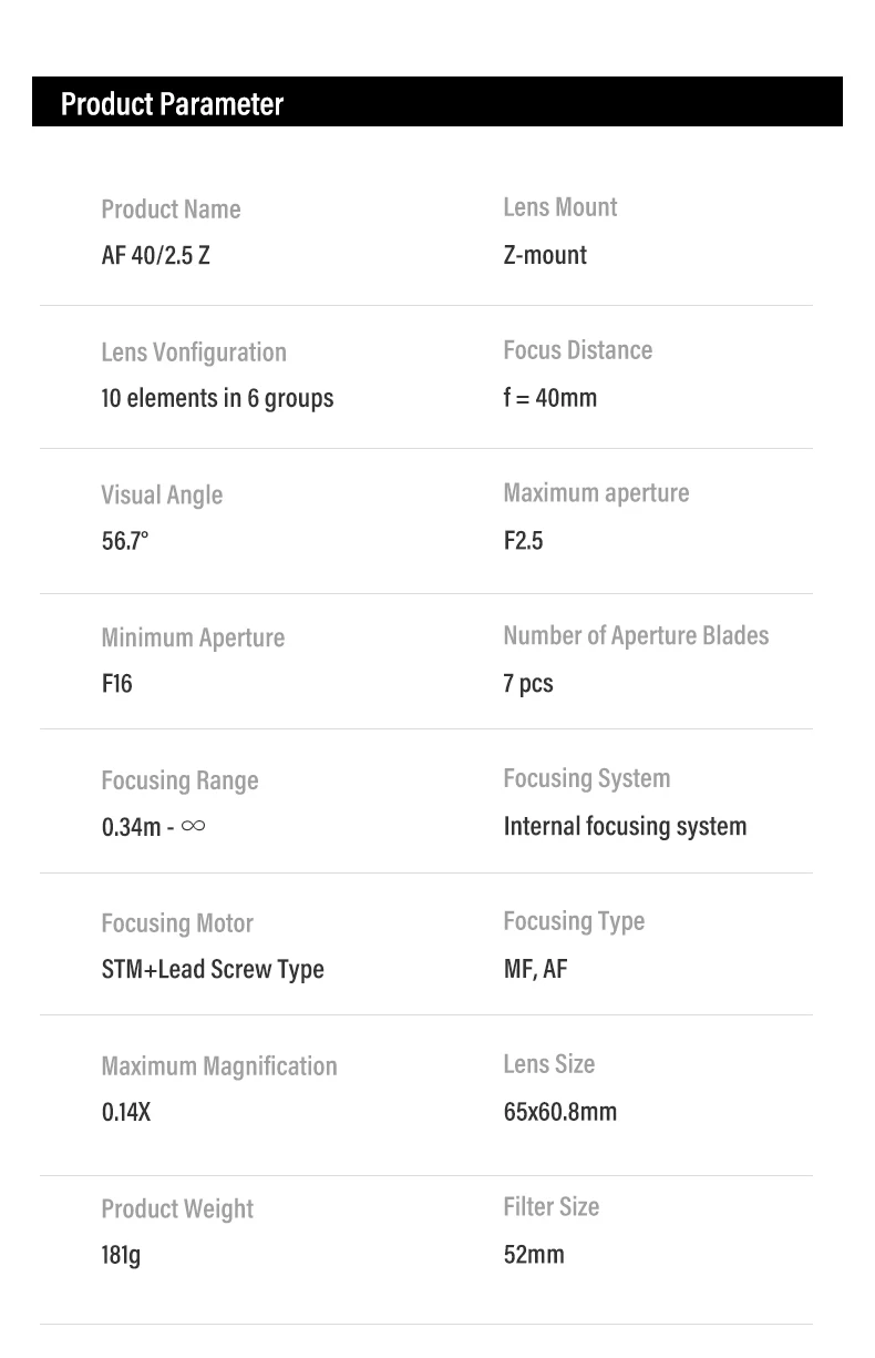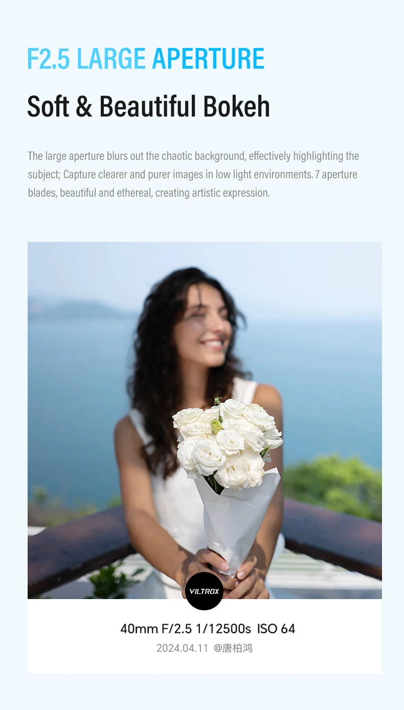 AF 40mm F2.5 Z, Viltrox Air series lightweight full-frame series introduces a 40mm focal length, efficient and precise autofocus system to capture wonderful moments, so that everyone can enjoy the fun of photography. Covers the full-frame image field and matches more models. Compact and lightweight lens body, easy to carry. The versatile 40mm focal length is ideal for daily shooting and travel.