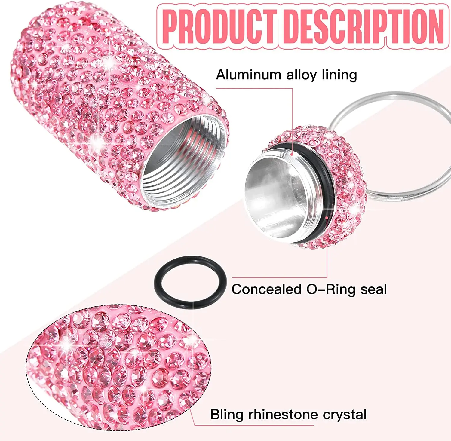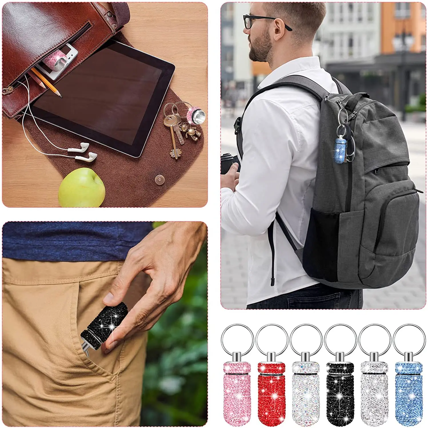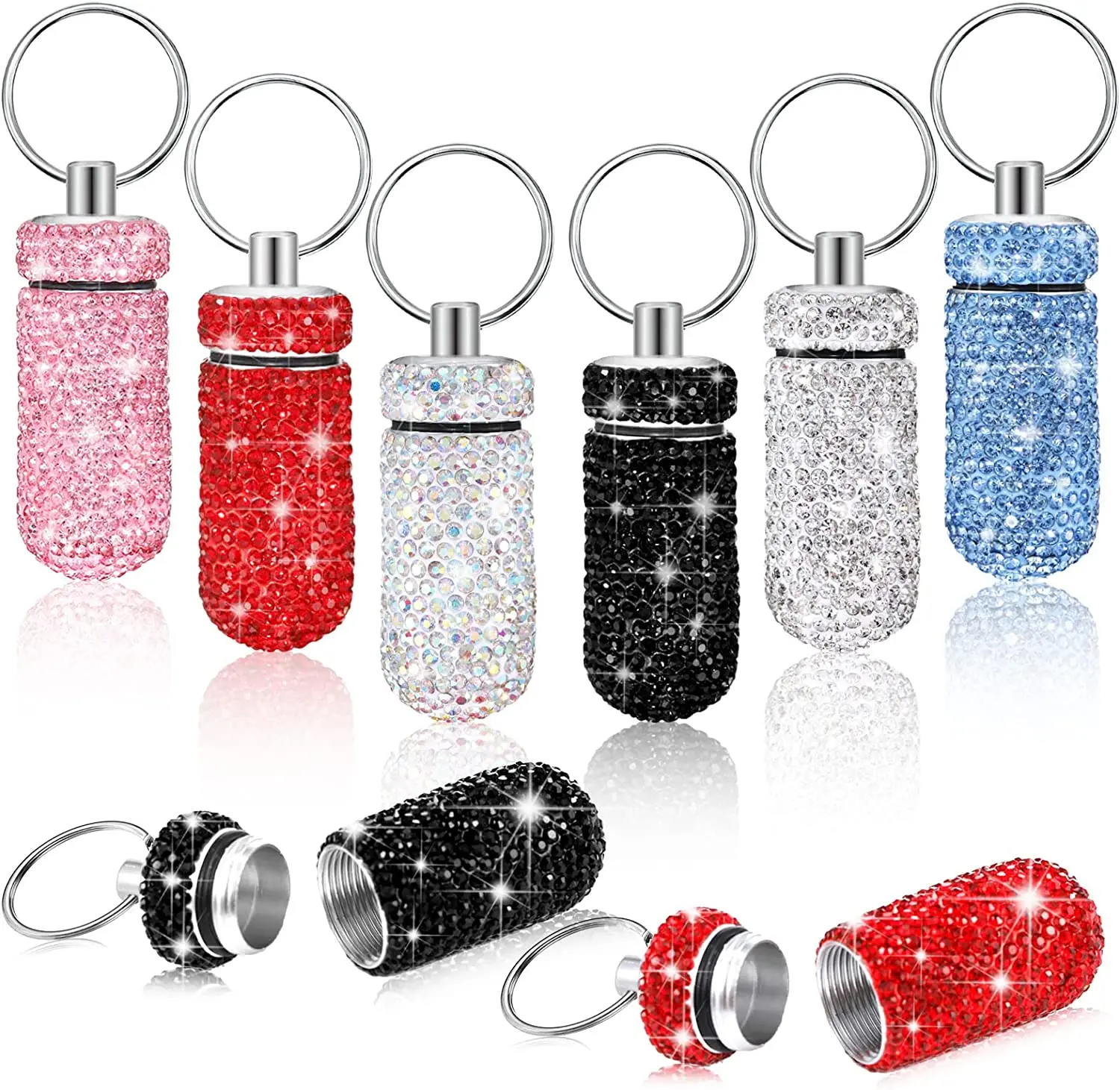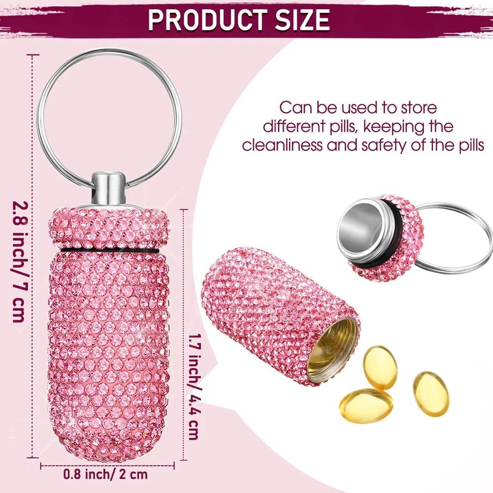O estojo para comprimidos de chaveiro inclui 6 cores diferentes, convenientes para você distinguir.O design de strass brilhante também pode combinar com a maioria dos tipos de roupas e brilhar ao sol, fácil de observar em caso de emergência.