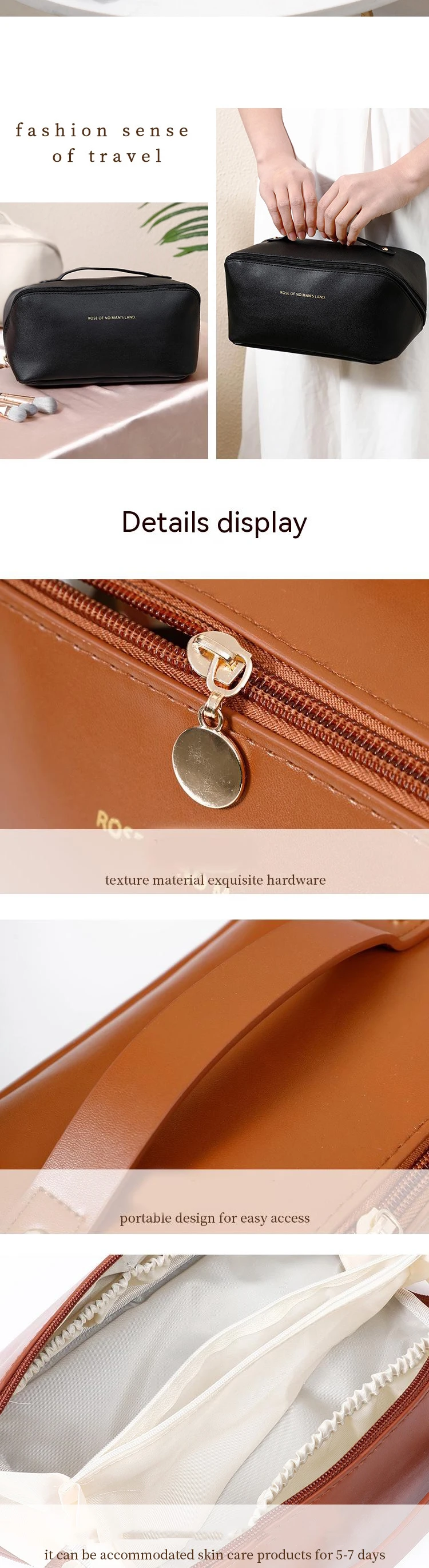 3.Esta bolsa de maquiagem para viagem é feita de material PU, com zíper liso de cor dourada e forro de design espesso.